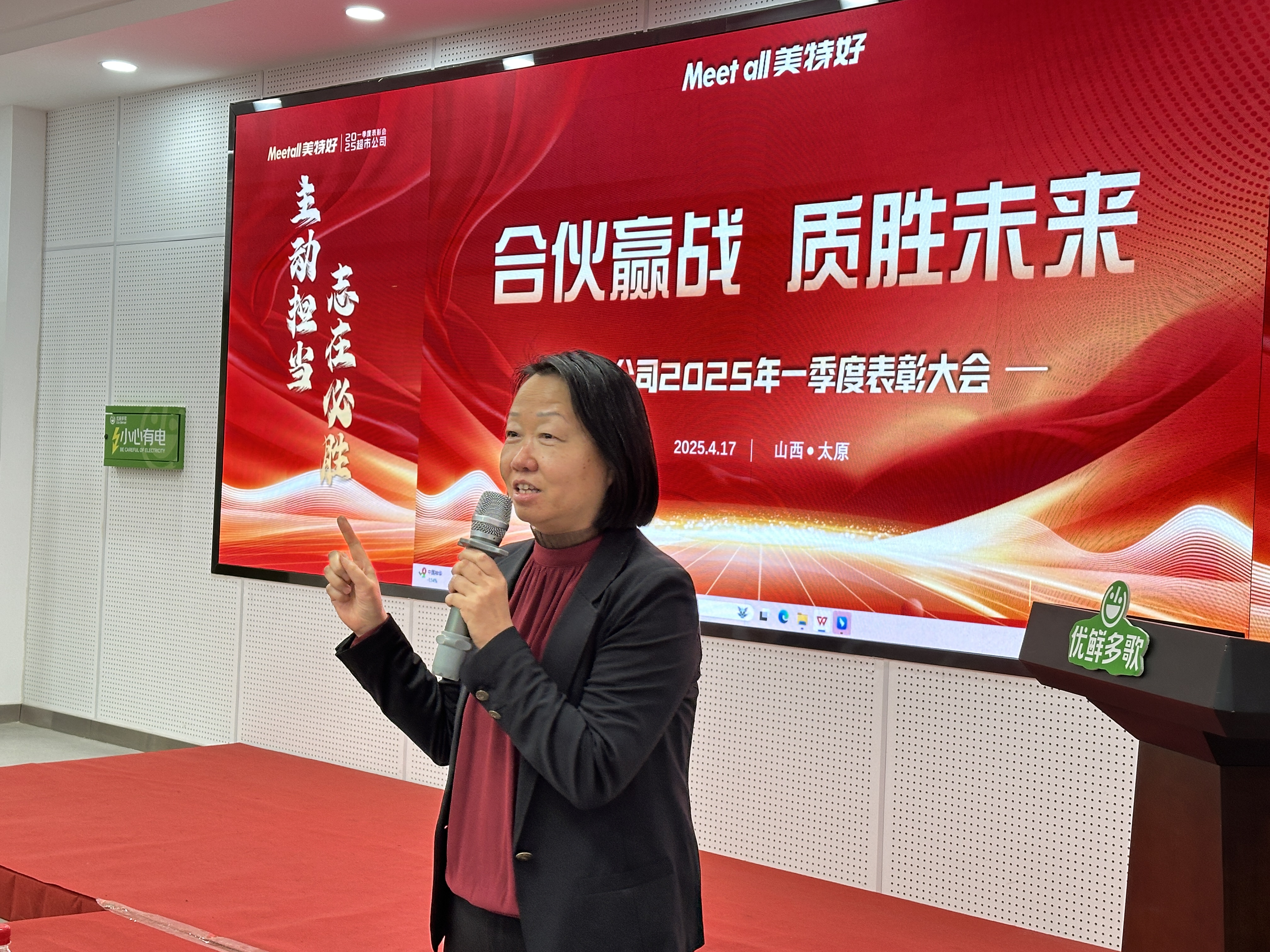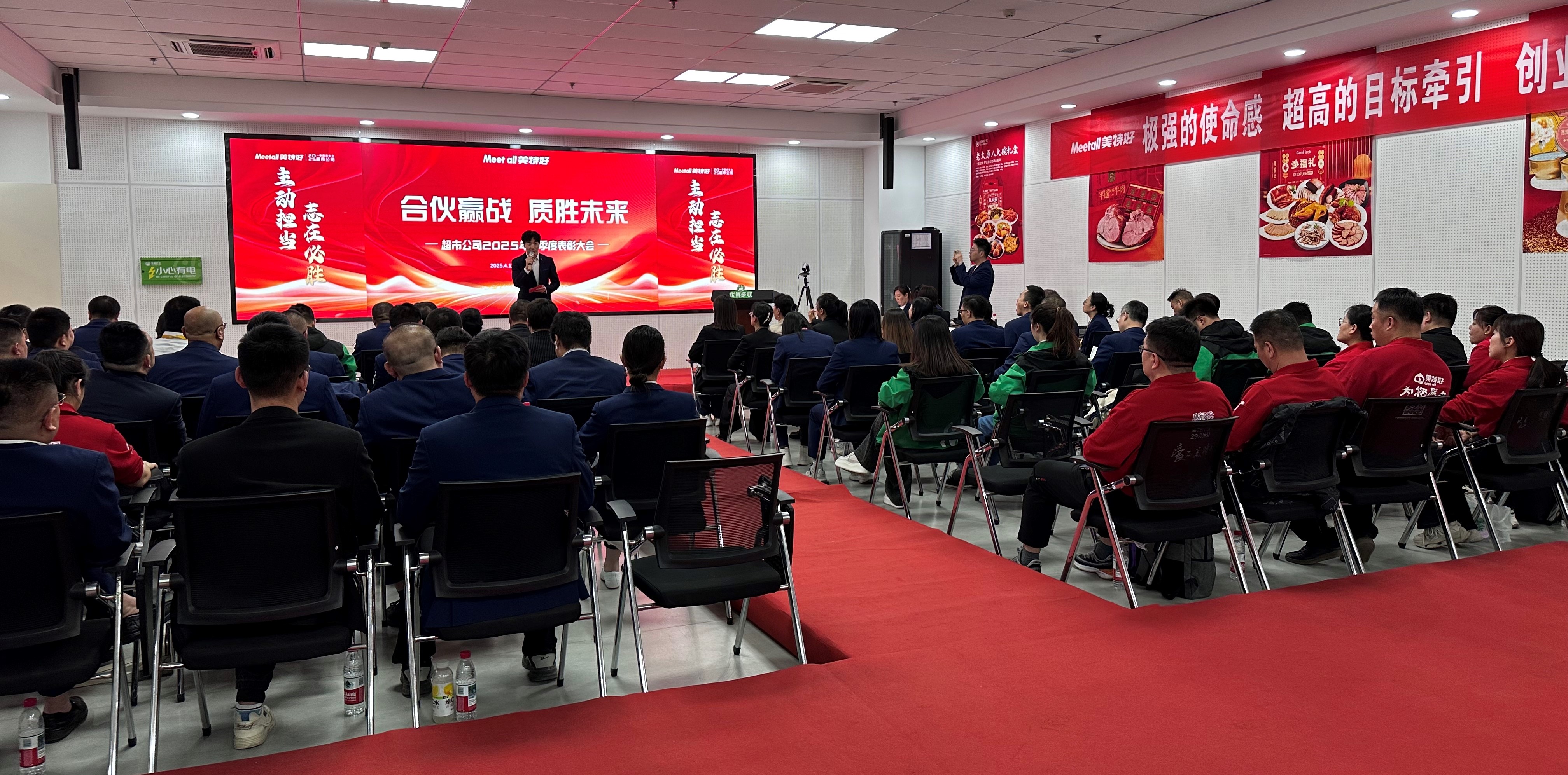 4月17日,美特好超市公司2025年第一季度表彰大會(huì)在優(yōu)鮮多歌清徐物流園大會(huì)議室隆重舉行。集團(tuán)總裁團(tuán)隊(duì)、各事業(yè)部及門(mén)店代表等270余名合伙人齊聚一堂,共同回顧一季度奮斗成果,表彰先進(jìn)典型,并擘畫(huà)二季度高質(zhì)量發(fā)展藍(lán)圖。本次大會(huì)以“合伙贏戰(zhàn)·質(zhì)勝未來(lái)”為主題,充分彰顯美特好“以顧客為中心,以?shī)^斗者為本”的核心價(jià)值觀,傳遞全員齊心沖刺年度目標(biāo)的堅(jiān)定信心。